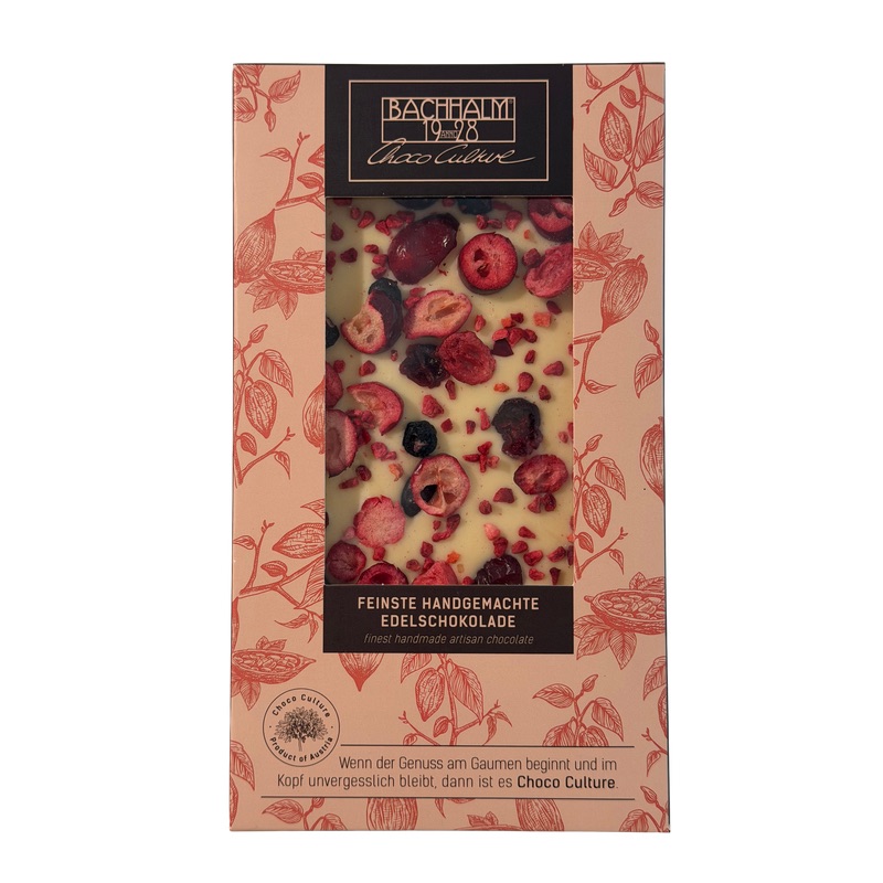 Zucker, Kakaobutter, Vollmilchpulver, 3% Joghurtpulver (Joghurt, Dextrose, Glukose, Säuerungsmittel: Milchsäure), 2,5% Waldfruchtmischung in veränderlichen Gewichtsanteilen (Heidel-,Preise-,Erd-, Himbeeren), Emulgator: Sojalecithine, natürlicher Vanilleextrakt Kann Spuren von Schalenfrüchten enthalten. Zu 100% aus nachhaltig angebautem Kakao hergestellt.