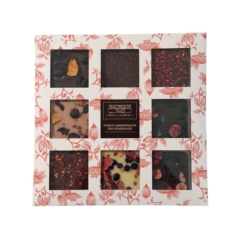 Kakaomasse, Zucker, Kakaobutter, Vollmilchpulver, 7% getrocknete Fruchtstücke in veränderlichen Gewichtsanteilen und Formen (Äpfel, Erdbeeren, Himbeeren, Mossbeeren, Heidelbeeren, Preiselbeeren) Johannisbeerfruchtsaftkonzentrat, kandierte Lavendelsamen Zucker 2,9% Lavendelsamen, Akaziengummi, Glukose, Farbstoff: Karmin, Indigotin), Himbeerqfruchtpulver (Maltodextrin, Himbeeren, Säurungsmittel: Zitronensäure), schwarzes Johannisbeerfruchtpulver,(Maltodextrin, schwarze Johannisbeeren), Rohrzucker, Joghurtpulver (Joghurt, Magermilchpulver, Säurungsmittel:Milchsäure, Pflanzenfaser, Dextrose, Glukosesirup, Aromen, lebende Milchkulturen), Pfeffermischung bunt, Paprika, Mandelöl, Antioxidantionsmittel: Alpha-Tocopherol, Emulgator: Sojalecithine, natürlicher Vanilleextrakt. Kann Spuren von Schalenfrüchten enthalten.